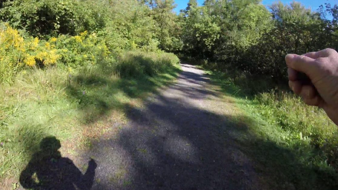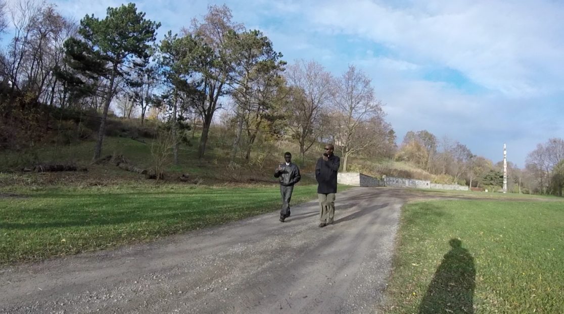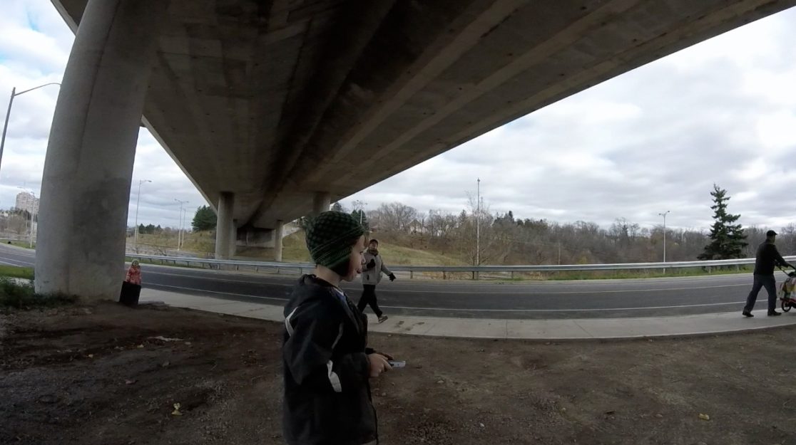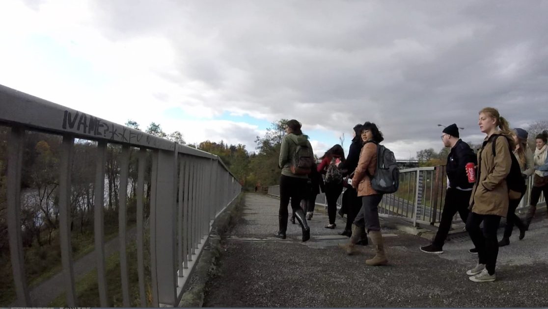 The “confluence” of the title is that of Dick’s Creek and Twelve Mile Creek, which is viewed during Confluence Field Trip #1 from the MIWSFPA to Rodman Hall Art Centre. About a hundred members of the school and general community responded to the call for participation and walked in seventeen walks throughout September 8 – November 14, 2015. The walks were conducted mostly in silence except for speaking into an audio recorder, while I walked with them wearing a chest-mounted camera.