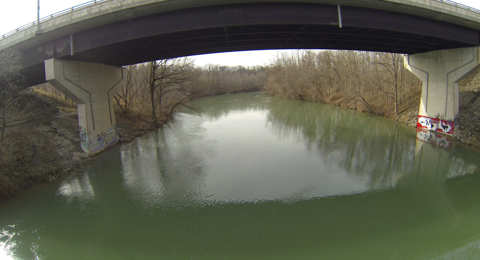 The source of the Twelve is in Pelham and its mouth is at Lake Ontario via Martindale Pond. The part of the Twelve in St. Catharines has been influenced for almost two centuries by industry, primarily the old Welland Canals and hydro-electric power generation. Just upstream from where you stand is the oldest continually-running hydro-electric station in Canada, Decew Generating Station 1, built in 1898 by a private company and acquired by the Province of Ontario in 1930. Beside it, is Decew Generating Station 2, built in order to power the industries of World War II, and made feasible in part by the raising of the level of The Great Lakes due the Ogoki and Long Lac diversions in the Lake Nipigon area.